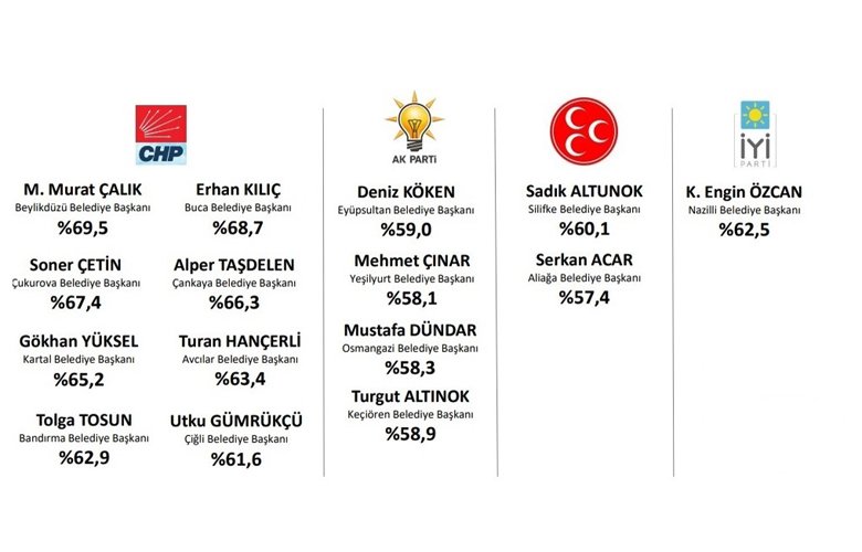Açıklanan verilere göre, Cumhuriyet Halk Partili Belediye büyükşehir belediye başkanları oylarını arttırırken AKP’li başkanların gerilediği görüldü. Araştırmada en fazla oy oranını arttıran başkan yüzde 36,1’den yüzde 53,3’e yükselen Muğla Büyükşehir Belediye Başkanı CHPli Osman Gürün olurken, en fazla oy kaybı yaşayan AKP’li başkan ise yüzde 60,8’den yüzde 45,3’e gerileyen Şanlıurfa Büyükşehir Belediye Başkanı Zeynel Abidin Beyazgül oldu.