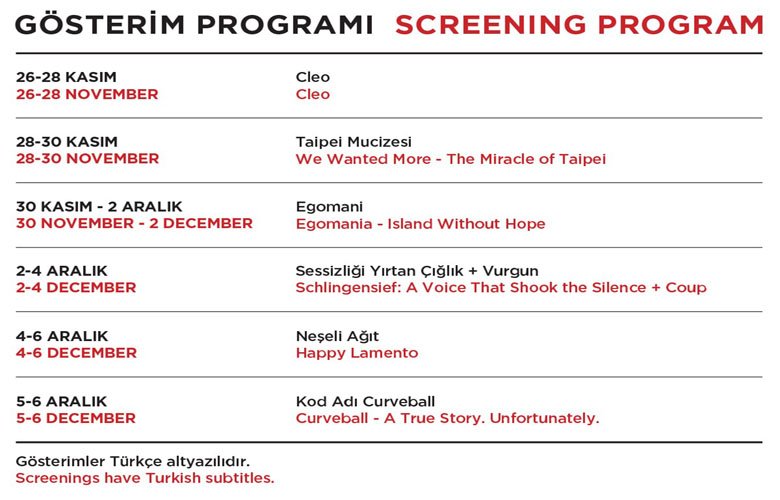 Öne çıkan filmleri arasında; Yamyamların Zamanı (Zeit der Kannibalen) filmiyle Johannes Naber’in yönettiği, Alman hükümeti ile istihbarat teşkilatının Irak savaşındaki rolünü gerçek hikâyeden uyarlayan kara komedi tarzındaki ajan filmi “Kod Adı Curveball, Christoph Schlingensief’in 40 yıllık sanat hayatını arşiv görüntüleriyle aktaran belgesel “Sessizliği Yırtan Çığlık”, yine Schlingensief’in kıyamet sonrası bir adada geçen ve dramatik fotoğraflarıyla dikkat çeken filmi “Egomani” bulunuyor. Programda eğlenceli bir aile filmi de yer alıyor. Erik Schmitt’in “Cleo” isimli film, izleyicileri Berlin şehrinin 800 yıllık tarihinde, renkli bir yolculuğa çıkarıyor.
