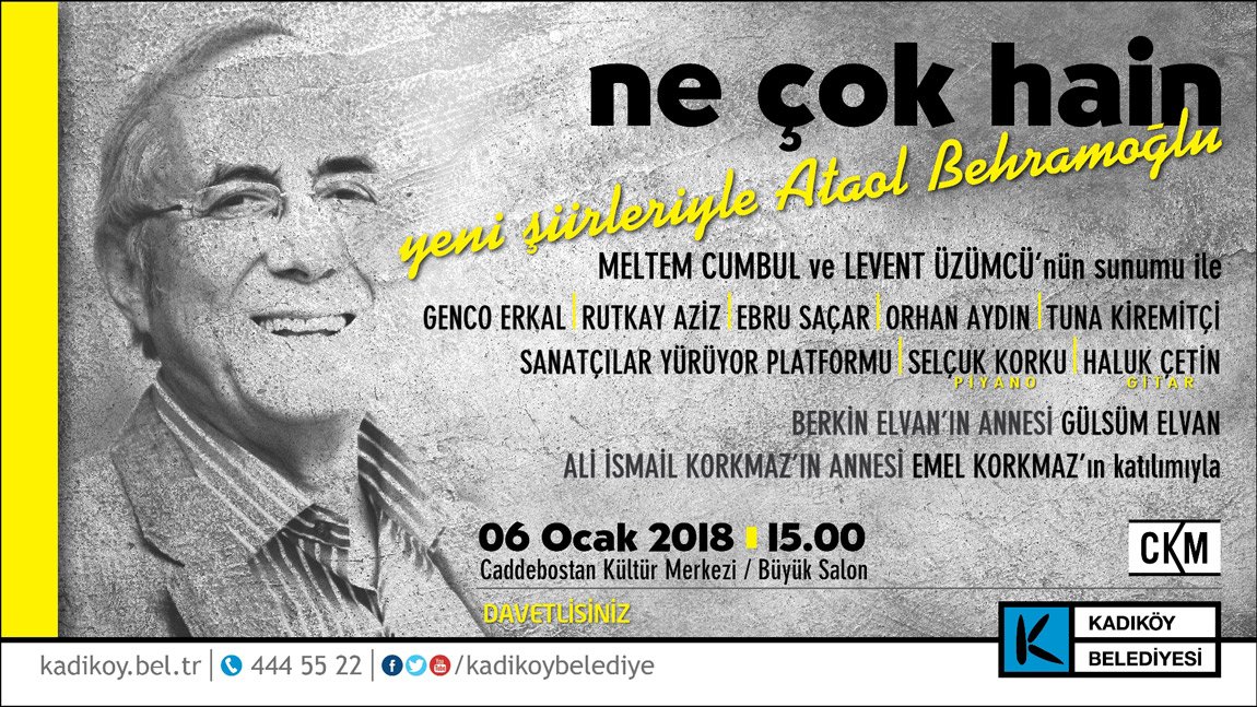 Ataol Behramoğlu’nun yeni kitabı Ne Çok Hain’de yer alan şiirler, usta sanatçılar tarafından seslendirilecek. Kadıköy Belediyesi tarafından düzenlenen etkinliğe Genco Erkal, Rutkay Aziz, Meltem Cumbul, Levent Üzümcü, Berkin Elvan’ın annesi Gülsüm Elvan, Ali İsmail Korkmaz’ın annesi Emel Korkmaz da katılacak.
