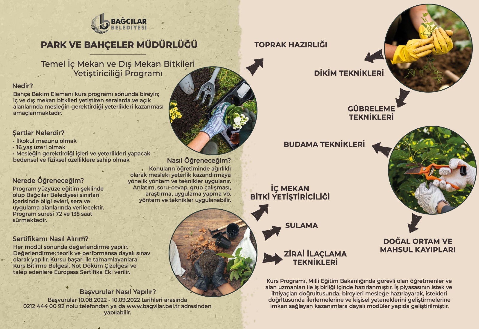 Belediyenin Bilgi Evleri ve seralarında gerçekleşecek derslerde; toprak hazırlığı, dikim teknikleri, budama teknikleri, iç mekân bitki yetiştiriciliği, sulama, zirai ilaçlama teknikleri, gübreleme teknikleri, doğal ortam ve mahsul kayıpları konularında eğitim verilecek. 72 ve 136 saat süreli eğitimleri başarıyla tamamlayanlara Kurs Bitirme Belgesi, Not Döküm Çizelgesi ve talep edenlere Europass Sertifika Eki takdim edilecek.