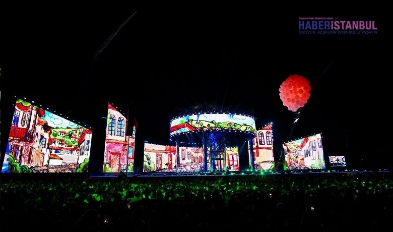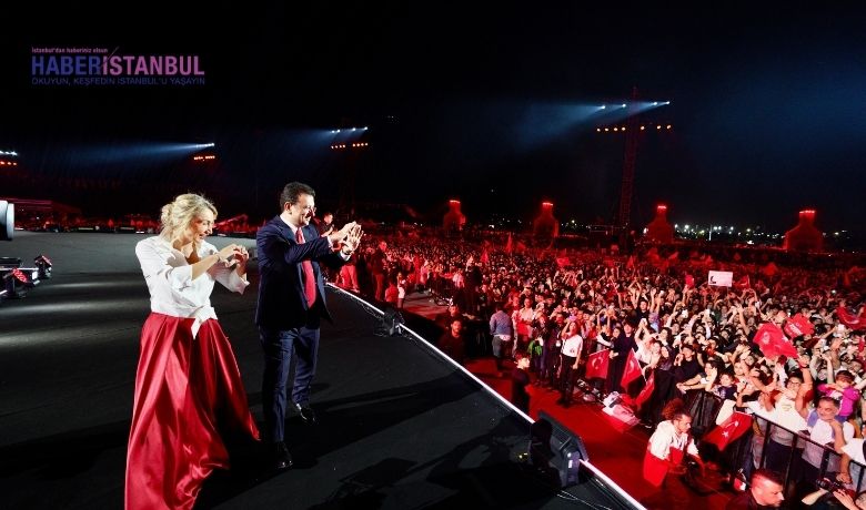 Boğaz Köprüsü şeklinde tasarlanan, en son teknoloji görüntü, ses, ışık ve otomasyon ekipmanları kullanılarak üretilen 150 metrelik sahnede, birbirinden ünlü sanatçılar İstanbullulara 100. yıl coşkusunu yaşattı. 16 metrelik ‘Cumhuriyet Çınarı’nın da yer aldığı sahneye, eşi Dr. Dilek Kaya İmamoğlu ve 142 mesai arkadaşıyla birlikte çıkan İBB Başkanı Ekrem İmamoğlu, dev Türk bayrağının elden ele iletilerek göndere çekilmesine destek verdi.