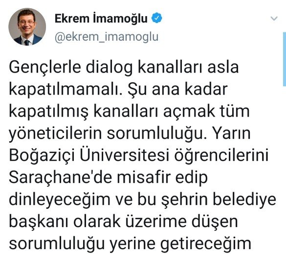 Son olarak 159 kişinin gözaltına alındığı olaylarla ilgili İstanbul Büyükşehir Belediye Başkanı Ekrem İmamoğlu’ndan bir açıklama geldi. İmamoğlu attığı tweet ile yarın öğrencilerle görüşeceğini; üzerine düşen sorumluluğu yerine getireceğini duyurdu. İşte o açıklama: