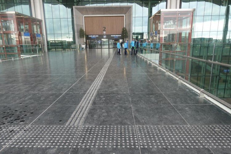 İstanbul Havalimanı’nda beyaz baston kullanan görme engelli misafirler için her alanda hissedilebilir yüzey uygulaması bulunuyor. Giriş kapılarında başlayan kılavuz yollar güvenlik noktalarında engelli yolcu öncelikli geçişlerden geçerek misafirlere güvenlik noktasında da kesintisiz bir hizmet sunuluyor.