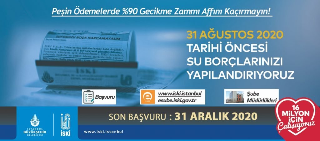 İstanbul Büyükşehir Belediyesi’nin (İBB) bağlı kuruluşlarından İSKİ , 7256 Sayılı “Bazı Alacakların Yeniden Yapılandırılması İle İlgili Kanun” kapsamında, abonelerin 31 Ağustos 2020 öncesine ait ödenmemiş su borçları yeniden yapılandırmaya başladı. Vatandaşlar, peşin ödemede yüzde 90 gecikme zammı indiriminden yararlanılabiliyor. Su borçları ikişer aylık dönemler halinde 36 aya kadar taksitle de ödenebiliyor.