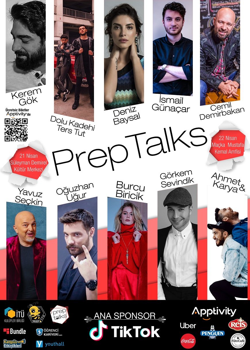 İstanbul Teknik Üniversitesi Hazırlık Kulübü (PrepİTÜ) tarafından gençlere ilham vermek amacıyla düzenlenen söyleşi etkinlikleri PrepTalks, Google Play’in “en eğlenceli” kategorisinde 2018 yılının en iyi uygulamalarından biri seçilen TikTok sponsorluğunda 21 Nisan Pazar günü İTÜ Süleyman Demirel Kültür Merkezi’nde başlıyor.