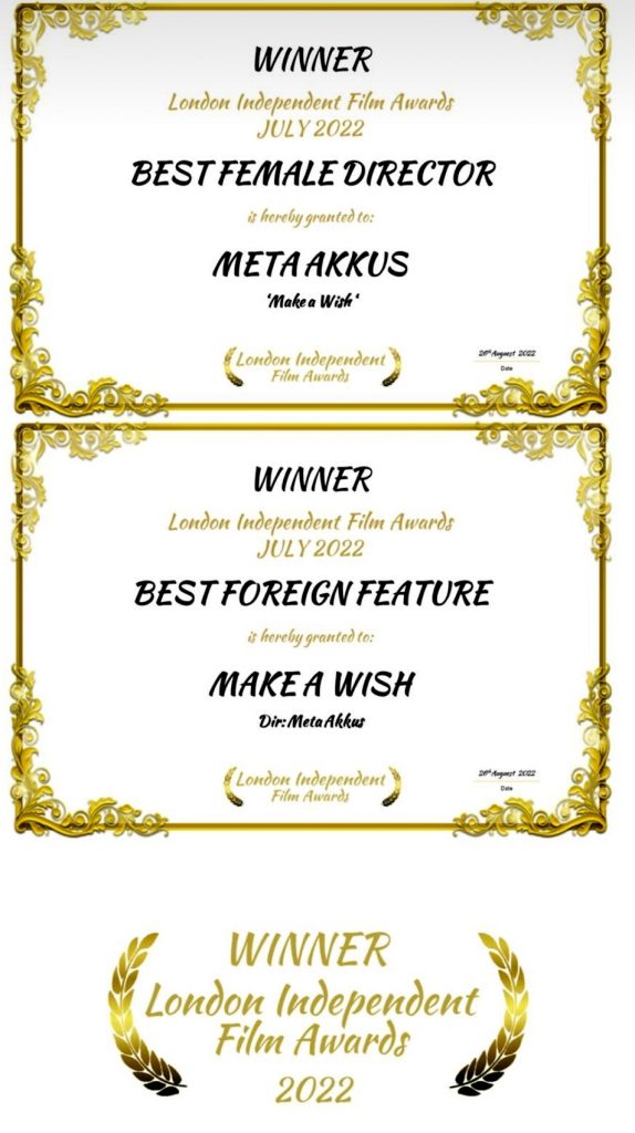 Meta Akkuş’un yapımcılığını ve yönetmenliğini üstlendiği “Bir Dilek Tut” (Make a Wish) isimli filmi ile London İnternational Film Awards töreninde, En İyi Kadın Yönetmen ve En İyi Yabancı Film Ödüllünü aldı. Geçen aylarda Amerika’da “Flickers’ Rhode Island international film festivali”de yarı finale yükselip, 7000 filmin yarıştığı festivalde binlerce filmi geride bırakarak yarı finalde yerini almayı başaran “Bir Dilek Tut” (Make a Wish) aynı zamanda bu festivalde yarı finale kalan ilk Türk filmi olmuştu.
