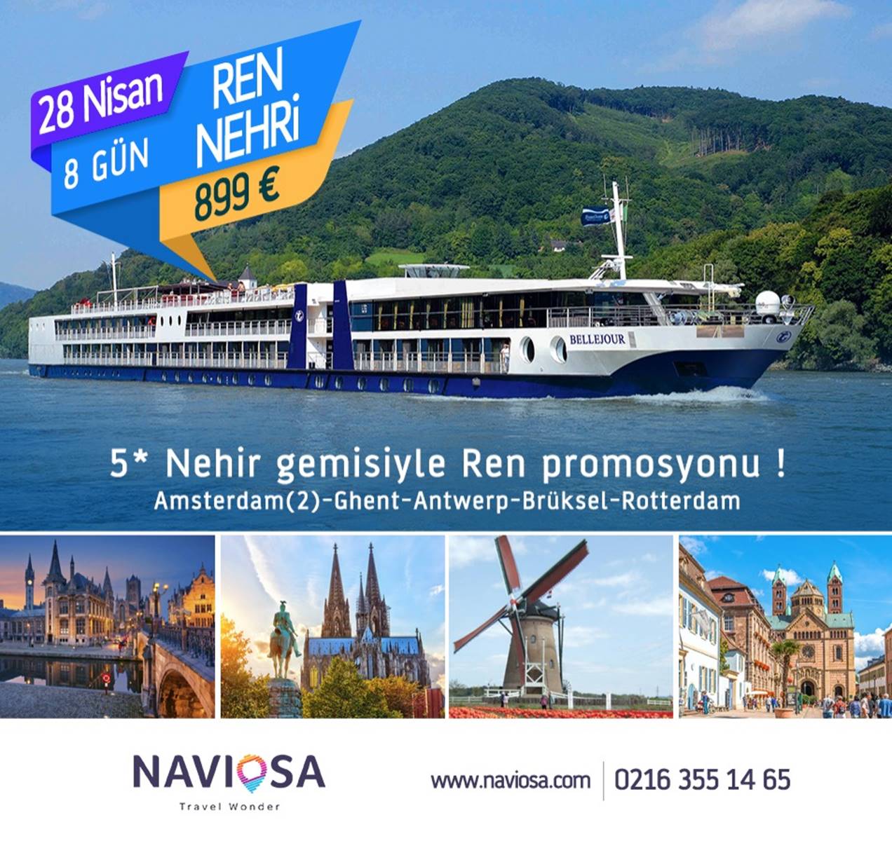 Ren Nehri turunun kişi başı katılım bedeli, yalnızca 899 Euro. Bir diğer deyişle, herhangi bir yurtdışı seyahatinin yalnızca yol masrafları kadar… Bu uygun fiyata Hollanda ve Belçika’nın en güzel şehirlerini Avrupa’nın en ünlü nehri üzerinden ve tam sekiz gün boyunca gezmek isterseniz, bu fırsatı kaçırmayın. “Seyahat Mucizesi” Naviosa, sizleri bekliyor.
