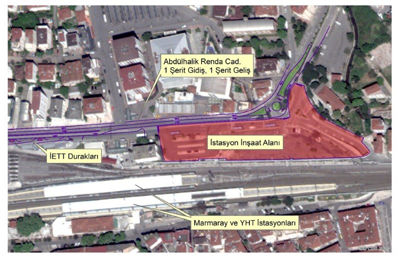 • İnşaat alanında bulunan İETT durakları, Marmaray İstasyonu’nun batısında Abdülhalik Renda Caddesi üzerine yerleştirilecek.