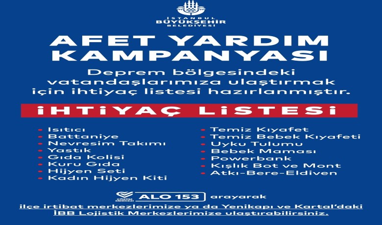 İBB deprem bölgesindeki afetzedelere ulaştırılmak üzere ‘Afet Yardım Kampanyası’ başlattı. Yardımda bulunmak isteyen İstanbullular, ALO 153 üzerinde oluşturulan ‘Deprem Hattını’ arayarak ihtiyaç listesi bilgisine ulaşabilirler. Yardımlar, Yenikapı Avrasya Gösteri Merkezi…