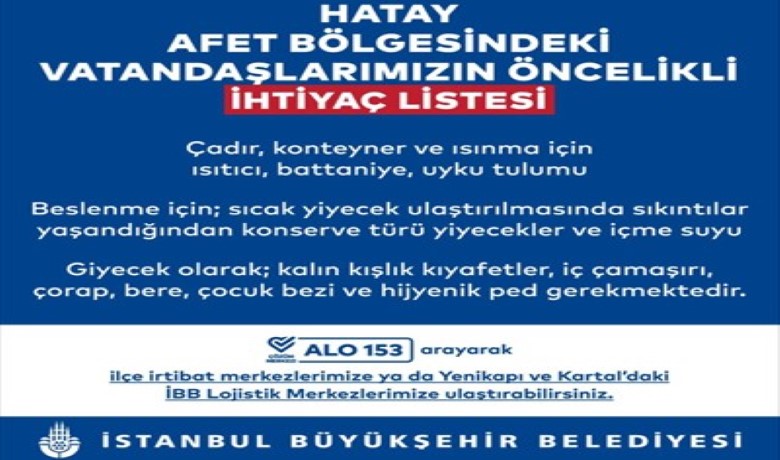 Hatay afet bölgesindeki vatandaşlarımızın öncelikli ihtiyaç listesi: Çadır, konteyner ve ısınma için ısıtıcı, battaniye, uyku tulumu. Beslenme için; sıcak yiyecek ulaştırılmasında sıkıntılar yaşandığından konserve türü yiyecekler. Giyecek olarak; kalın kışlık…