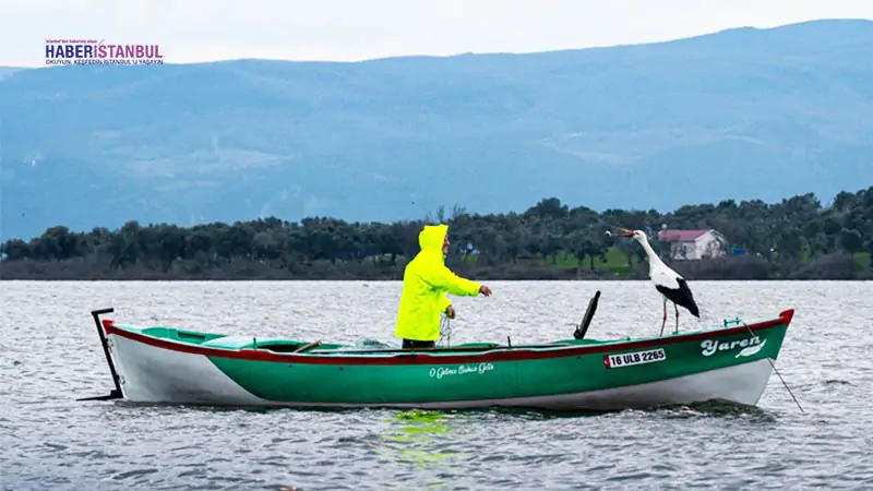 Yaren leyleğin, göl manzaralı yuvasının bulunduğu mahallede balıkçı Yılmaz’ın kayığındaki geleneksel pozu, doğa ve yaban hayatı fotoğrafçısı Alper Tüydeş tarafından kayda alındı.